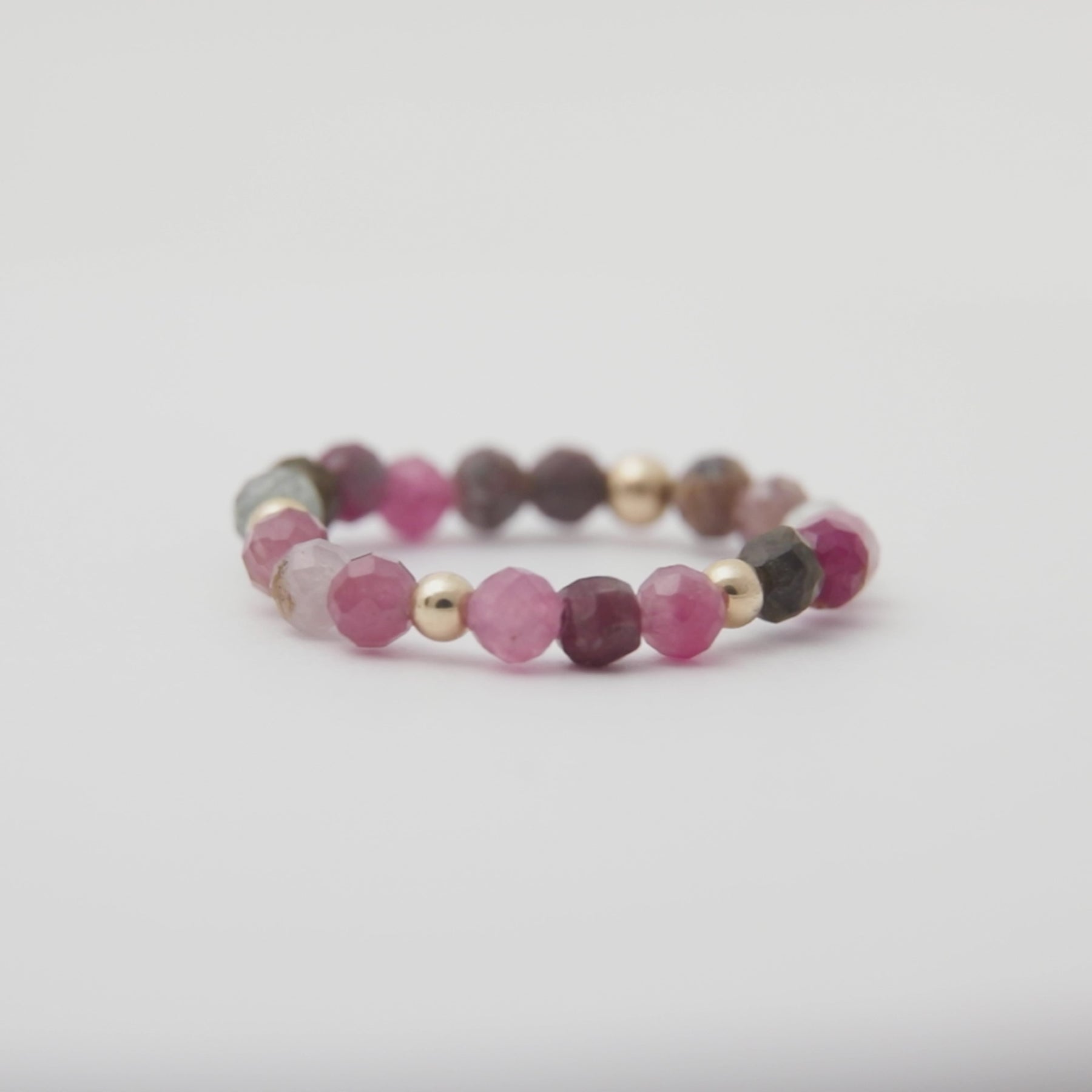 Ein filigraner Ring aus 2,5 mm facettierten Turmalin-Kügelchen auf elastischem Band. Die leuchtenden Naturfarben changieren zwischen zart und kraftvoll – nie gleich, immer im Fluss.